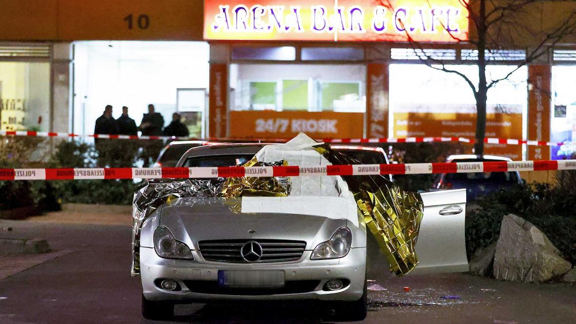 Une Mercedes-Benz argentée recouverte de ce qui ressemblait à une couverture de survie pouvait être vue derrière un cordon de police et entourée d’officiers devant le «Arena Bar», avec du verre brisé au sol.