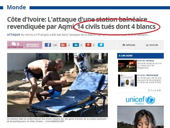 Le premier annonçait: Côte d’Ivoire: « L’attaque d’une station balnéaire revendiquée par Aqmi, 14 civils tués dont 4 blancs »