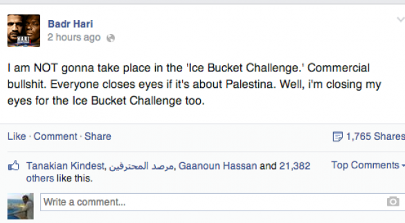 Badr Hari refuse catégoriquement de prendre part à cette initiative qu’il qualifie de « Commercial Bullshit ». Sur Facebook, il déplore notamment qu’il n’y ait pas eu autant de mobilisation pour la cause palestinienne et rappelle à juste titre que pendant ce temps là de nombreux africains meurent de soif….