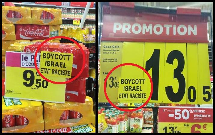 Dans le magasin Carrefour de Sartrouville (Yvelines) des activistes pro-palestiniens ont collé des stickers «Boycott Coca-Cola état raciste» sur les produits Coca-Cola.