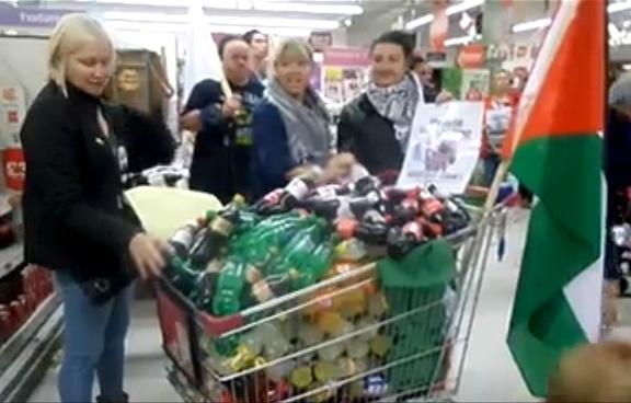Au supermarché Sainsbury, situé à l’ouest de Belfast, plusieurs personnes ont retiré des produits israéliens des rayons, dont ceux issus de la société Coca-Cola (Pepsi, Fanta etc.) afin de protester contre l’apartheid israélien. Ils ont ensuite récupéré les marchandises dans des caddies, afin qu’elles ne soient pas achetées par les consommateurs.