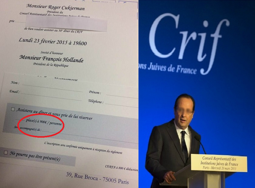 Comme grossièrement indiqué sur le billet d’invitation, le Conseil représentatif des institutions juives de France facturerait 900€ la place, rien que ça !