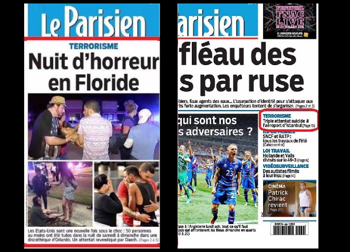 En effet, alors que les attentats d’Orlando on obtenu la Une du journal accompagnées de photos bouleversantes, celles de la Turquie n’ont pu investir qu’un petit encadré presque oublié sur le côté de la première page du journal.