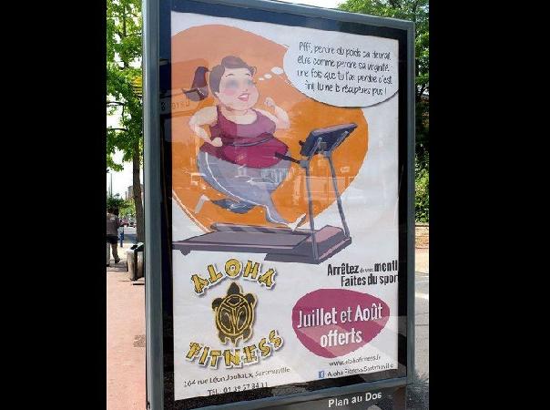 La salle de sport a lancé une campagne publicitaire qui met en scène une femme ronde illustrée sur un tapis de course qui en pleine séance de sport se dit dans son esprit : « Pfff faire du sport ça devrait être comme perdre sa virginité, une fois que tu l’as perdue c’est fini, tu ne le récupères plus! ». Puis on retrouve un mauvais slogan sous forme de non-sens: « Arrêtez de vous mentir faites du sport!».