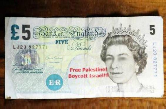 En Grand-Bretagne, des billets de banque en livre sterling ont été tamponné d’un « Free Palestine, Boycott Israël »: