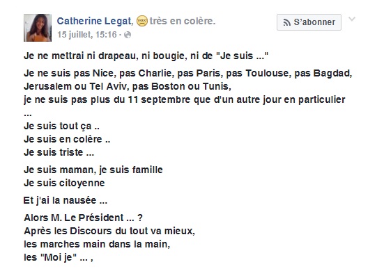 En effet, elle déclare n’être pas « Charlie, pas Paris, pas Toulouse, pas Bagdad », ne pas vouloir mettre de drapeaux, bougies etc.. Tout simplement pour ne pas une nouvelle fois se faire avoir par les beaux discours des politiques qui ne font que de la récupération et décident surtout d’agir de leur propre façon en continuant sans cesse les attaques en Syrie alors que « C’est sur notre sol que des enfants meurent … »