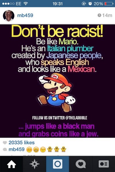 « Ne soyez pas racistes ! Soyez comme Mario, c’est un plombier italien, créé par des Japonais, qui parle anglais et qui ressemble à un Mexicain. Saute comme un noir et attrape l’argent comme un juif. »