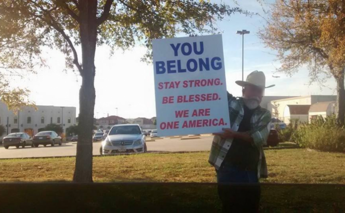 C’est le cas du texan Justin Norman qui, sur cette photo, brandit un message de paix. Sur sa pancarte, on peut lire le message suivant « Soyez des nôtres, restez forts, soyez bénis, nous formons une seule Amérique », et c’est à un endroit symbolique qu’il a choisi de se faire photographier: le centre islamique d’Irving, près de Dallas.
