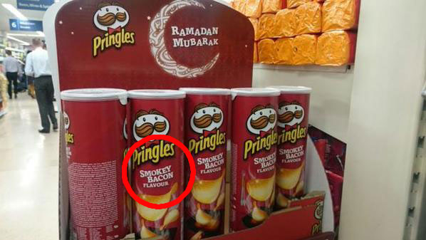 Dans ce méli-mélo ramadesque, un supermarché britannique de la marque Tesco a décidé, comme les autres, d’y aller de sa petite promotion destinée à attirer une clientèle plutôt musulmane. Un îlot a été installé au centre du magasin nommé pour l’occasion « Ramadan Mubarak » où s’entassent des dizaines de boîtes de chips Pringles. Mais pas n’importe quelles chips, celles au goût bacon fumé, plus appréciées de la communauté musulmane, comme nous le savons !