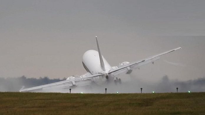 En ce jour de vents violents, un Boeing 737 qui tentait d’atterrir, a basculé pour toucher le sol projetant l’aile droite de l’avion au sol.