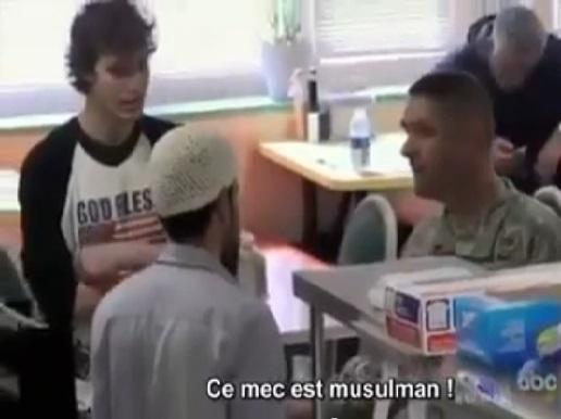L’émission américaine de télévision américaine “What Would You Do ?” (Qu’auriez-vous fait ?), a eut l’idée de filmer en caméra caché, l’intervention d’un soldat américain en train défendre un serveur musulman victime de critiques et d’insultes de la part d’un jeune client (complice de l’émission).