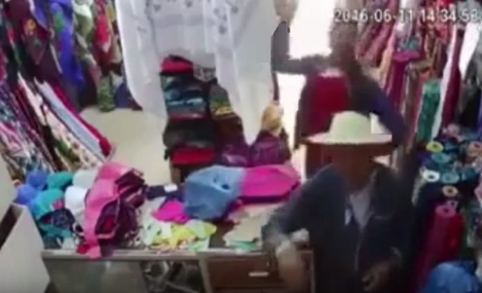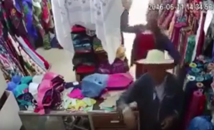 Alors que le commerçant plie tranquillement sa marchandise, un voleur s’introduit dans le point de vente et échange quelques mots avec le vendeur avant de lui asséner plusieurs coups de marteau dès que celui-ci a le dos tourné.