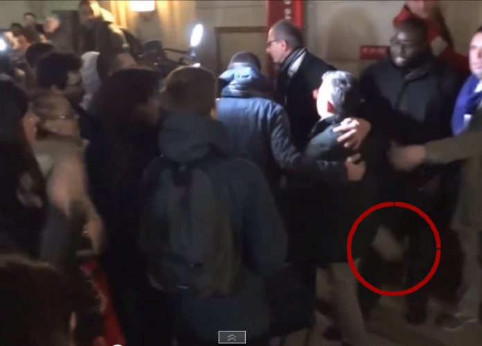 Ce jour-là présent comme à son habitude, plus fidèle qu’un fan invétéré, il se fait copieusement huer par les amis de Dieudonné. Après le jugement pour lequel Dieudo écope de 2 mois de prison avec sursis, Haziza quitte la salle et passe devant l’un des gardes du corps de la bête immonde on le voit sur la vidéo qui assène un coup de pied vicieux et rapide avant de s’enfuir lâchement de peur que le sbire ne le rattrape.