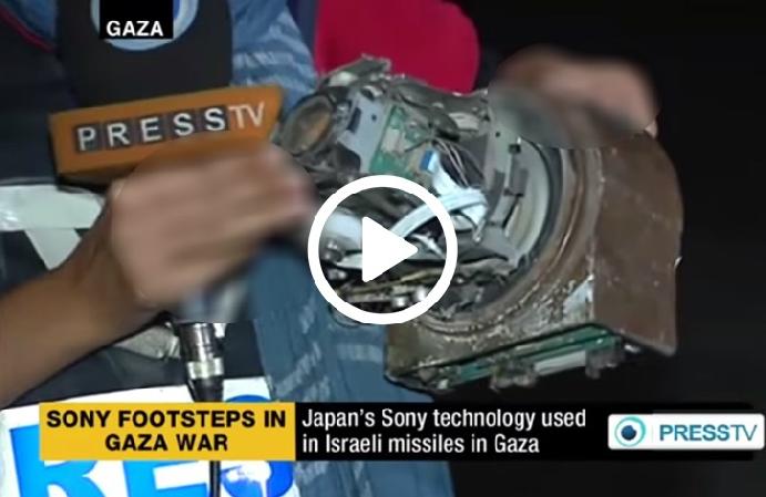 A Gaza, une reporter de la chaîne d’information Press TV montre avec stupeur un fragment d’une fusée israélienne comportant des composants électroniques appartenant à la société Sony Corporation !