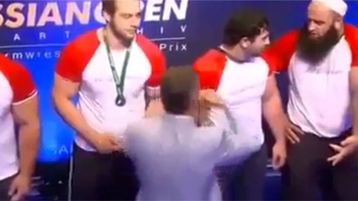 La réaction de ce champion russe musulman face à une femme dévêtue force l’admiration. A l’Open de Russie 2013 lors de la cérémonie de remise des médailles dans la catégorie Bras de fer, un sport très prisé en Russie, un musulman se voit, comme ses partenaires, récompensé après la victoire.