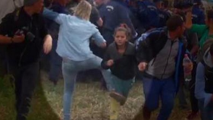 Les gens se bousculent, un père de famille est violemment poussé par un agent, alors qu’il tient un enfant dans ses bras. C’est à ce moment précis qu’une journaliste hongroise tend volontairement sa jambe pour faire tomber le réfugié à terre.