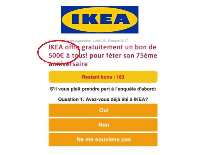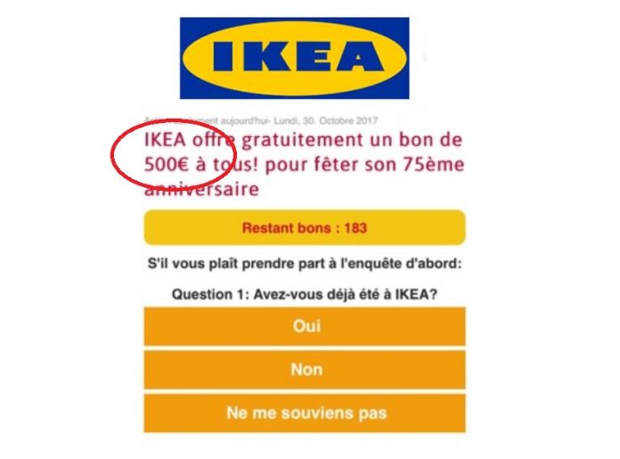Cette fois-ci, il s’agit d’un bon de réduction IKEA promettant un bon de 500 euros en l’honneur du 75ème anniversaire de l’enseigne.