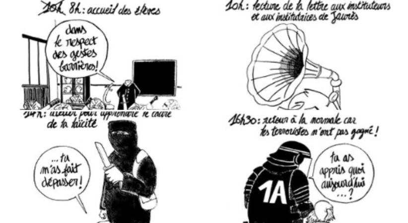 – 14h : un atelier pour apprendre le cadre de la laïcité dirigé par un terroriste encagoulé s’apprêtant à décapiter un de ses élèves,…