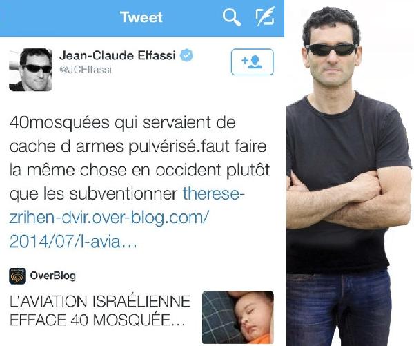 Jean Claude Elfassi, qui n’a visiblement rien d’autre à faire que de vomir son islamophobie constante sur Twitter, fait décidément tout pour qu’on lui accorde ne serait-ce qu’un peu d’attention. Cette fois, le grand “paparazzi-philosophe” a décidé de faire de nouveau parler de lui en appelant vivement à détruire les mosquées en occident comme l’ont fait l’armée israélienne récemment à Gaza :