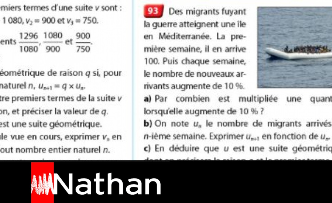 « Des migrants fuyant la guerre atteignent une île en Méditerranée. La première semaine, il en arrive 100. Puis chaque semaine, le nombre de nouveaux arrivants augmente de 10% », indique l’énoncé du problème à la page 34 de l’ouvrage, avant de décliner plusieurs questions mathématiques classiques.