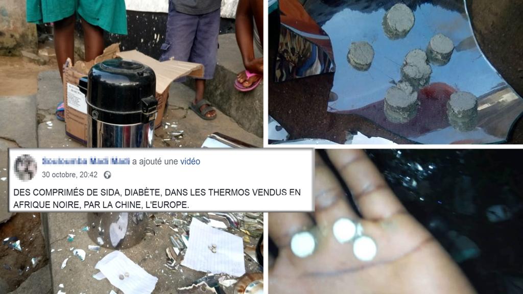 Des comprimés de Sida, diabète, dans les thermos vendus en Afrique noire par la Chine, l’Europe. La Chine est le cheval de Troie des Blancs génocidaires, indique un commentaire sur l’une des vidéos partagées sur Facebook.