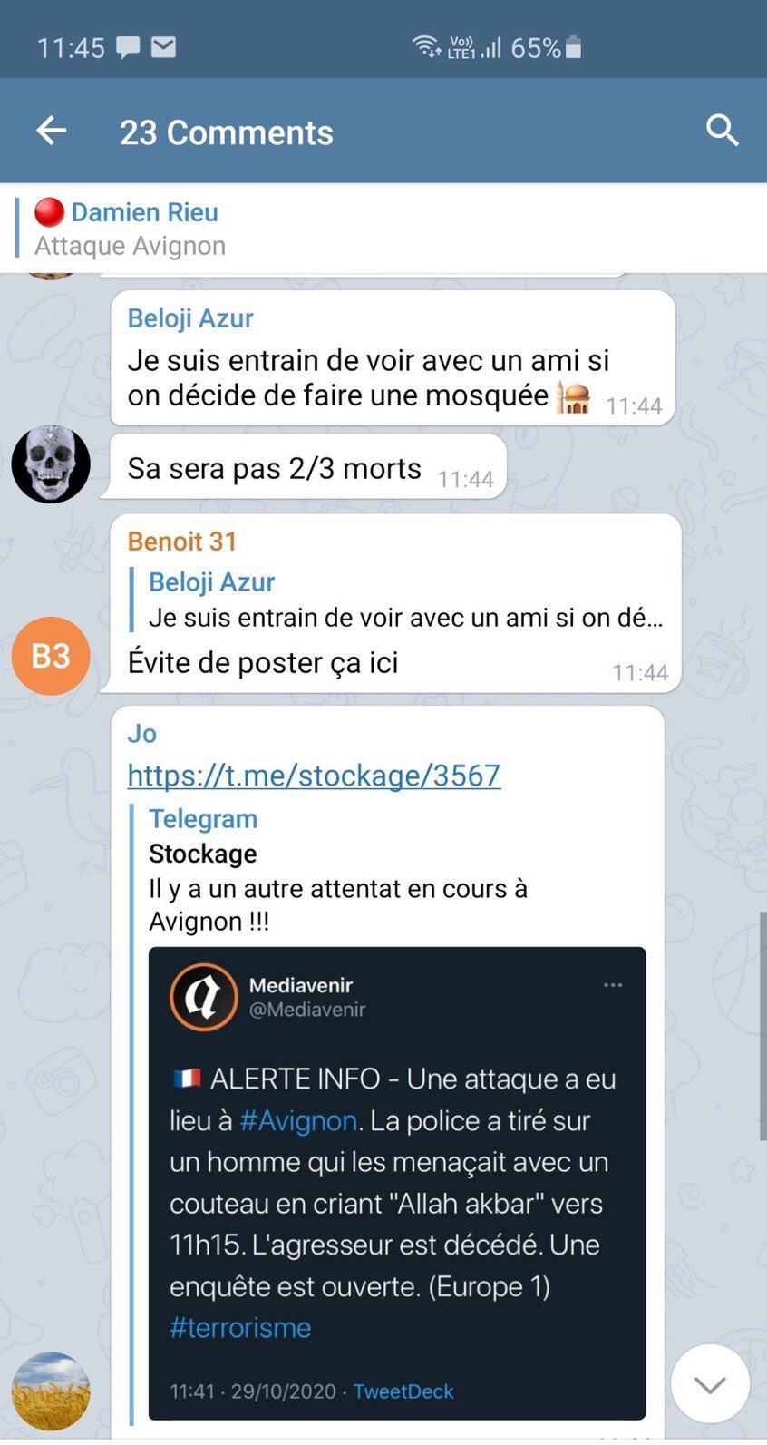 Hier, un certain Beloji Azur a posté « Je suis en train de voir avec un ami si on décide de se faire une mosquée. Ça sera pas 2/3 morts. » Avant qu’un autre membre, ne le coupe dans son élan « Evite de poster ça ici », sans pour autant condamner ces propos.