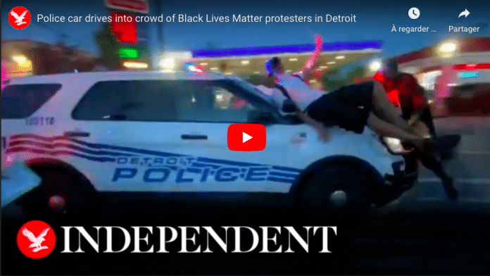 Détroit – Ce qui a commencé comme une manifestation pacifique contre la brutalité policière à Detroit a pris un tour inquiétant dimanche soir quand une foule de manifestants a entouré un véhicule de police et certains manifestants ont sauté sur le SUV alors qu’il traversait la foule.