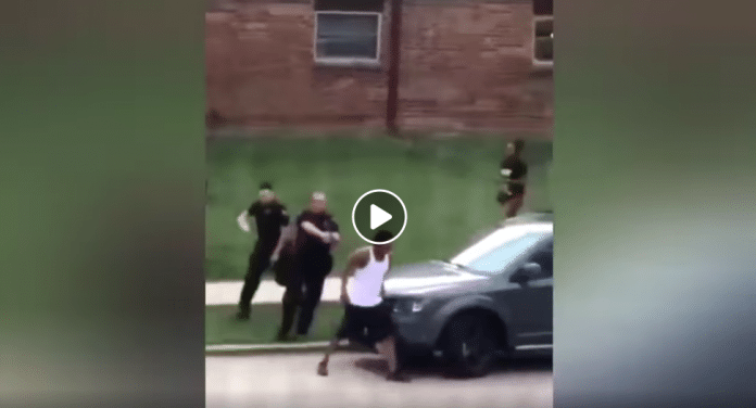 La vidéo semble avoir été prise de l’autre côté de la rue. Comme décrit par l’Associated Press, trois officiers sont d’abord entendus crier et pointer leurs armes sur un homme qui marche à l’avant d’un véhicule utilitaire sport garé dans la rue.