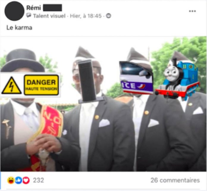 Le montage se veut satirique, il fait surtout l’apologie de morts violentes mettant en cause des policiers. Chacun des symboles grossièrement collés sur les visages des 4 porteurs de cercueils ghanéens est une allusion lourde de sens. Le panneau « danger haute tension » pour la mort de Zyed et Bouna en 2005. Un poteau, pour le décès de Sabri à Argenteuil le 17 mai dernier. Une portière d’un véhicule de police en référence à la jambe écrasée d’un homme de 30 ans à Villeneuve-la-Garenne pendant le confinement. Et enfin un train, comme celui qui a enlevé la vie à Kémyl, 18 ans, à Montigny-lès-Cormeilles le 27 mai. Le montage – titré « le karma » – a été diffusé sur Facebook par un fonctionnaire de police parisien et approuvé par plus de 200 membres des forces de l’ordre, révèle Streetpress.