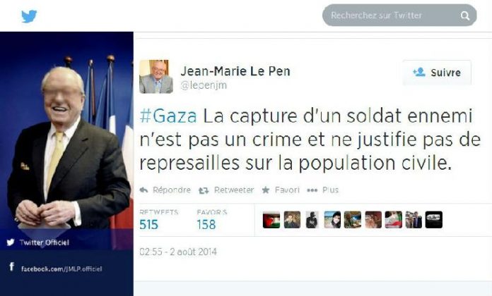 Après avoir affiché un franc soutien envers la cause palestinienne en déclarant que « Personne ne pouvait rester indifférent devant le véritable martyr que subit la population palestinienne », Jean Marie Le Pen revient avec un tweet assez surprenant, en référence à un soldat israélien enlevé: