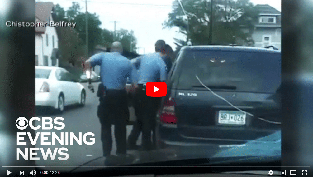 On y voit trois policiers posant leur genou sur lui, alors qu’un autre reste debout.