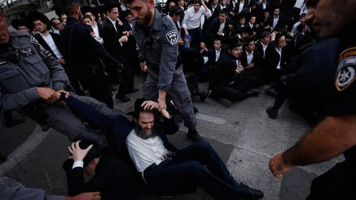 Hier, la police israélienne a violemment battu des juifs ultra-orthodoxes qui protestaient contre la conscription dans l’armée d’occupation israélienne, de laquelle ils étaient exemptés jusqu’à une décision de justice rendue en juin de cette année. Les manifestations se poursuivent depuis, et seuls un petit nombre de juifs haredim se sont enrôlés.
