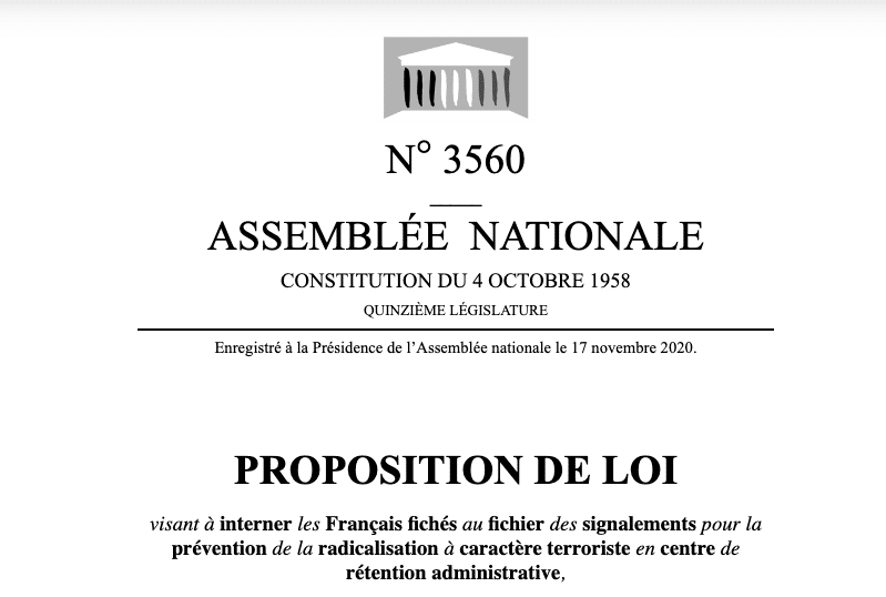 La proposition de loi vise « à interner les Français fichés au fichier des signalements pour la prévention de la radicalisation à caractère terroriste en centre de rétention administrative»
