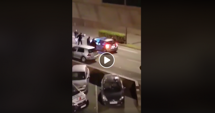 Sur le trottoir d’en face, une conductrice vraisemblablement paniquée de la situation tente d’échapper aux policiers et perd le contrôle de son véhicule. Prise de panique, la conductrice crie de peur au volant de sa voiture.