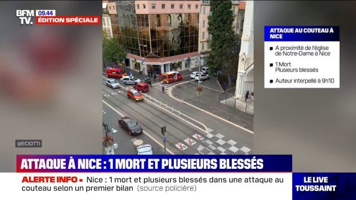 Je suis sur place avec la @PoliceNat06 et la @pmdenice qui a interpellé l’auteur de l’attaque. Je confirme que tout laisse supposer à un attentat terroriste au sein de la basilique Notre-Dame de #Nice06. pic.twitter.com/VmpDqRwzB1