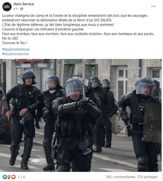 Hier après la Marche des Libertés, la page Facebook Hors Service qui rassemble des dizaines de milliers de policiers a publié un message appelant clairement à ouvrir le feu sur les manifestants.