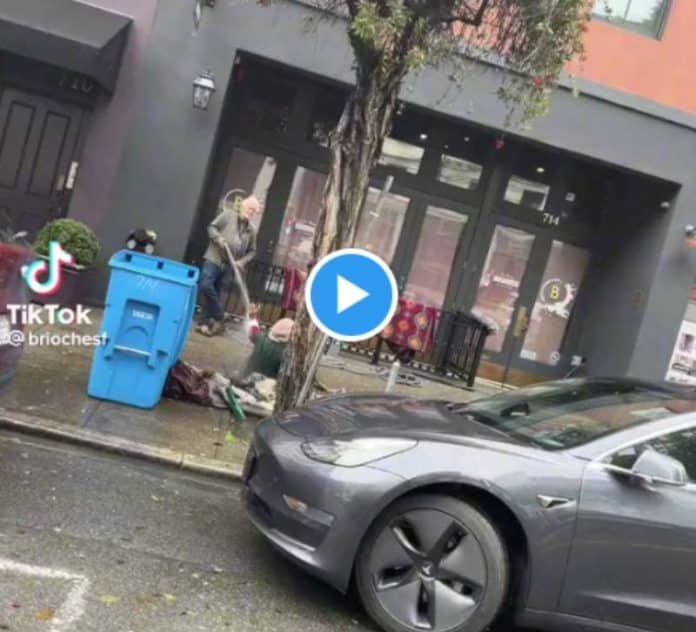 USA. Collier Gwin, propriétaire d’une galerie d’art à San Francisco, asperge une sans-abri avec un tuyau d’arrosage @BuzzAmerique pic.twitter.com/yAUjd9crDO