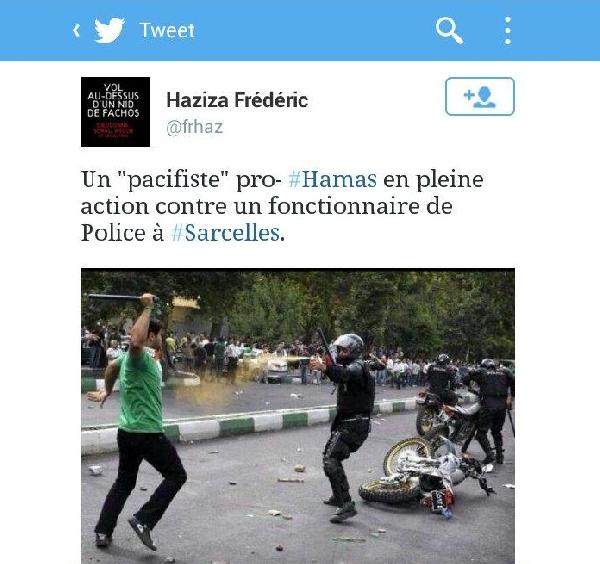 Mais petit problème, la photo en question n’a strictement rien à voir avec ce qui s’est déroulé à Sarcelles, puisqu’il s’agit d’une photo prise en Iran en 2009 peu après les élections dans lesquelles Mahmoud Ahmadinejad avait été déclaré vainqueur.