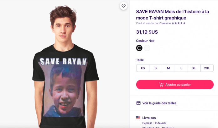 Face à l’émoi que suscite l’histoire du petit Rayan piégé dans un puits asséché au Maroc, des individus malintentionné ont lancé un modèle de t-shirt pour tenter de gagner un maximum d’argent. Sur le site Redbubble, toute une gamme de t-shirt et d’accessoires à l’effigie du jeune garçon est proposée aux clients.