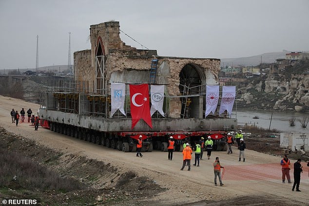 Une mosquée de 609 ans est transportée à trois kilomètres et demi d’une ancienne ville turque qui doit être inondée. La mosquée Er-Rizk est déplacée d’Hasankeyf, qui va être inondée en raison de la construction du barrage Ilisu, vers le nouveau parc culturel Hasankeyf.