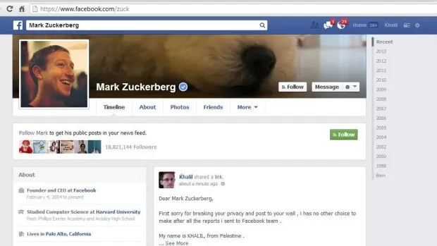 Après plusieurs tentatives pour avertir les équipes techniques de Facebook, le hacker palestinien Khalil Shreateh est passé à l’acte en écriant un message sur le mur Facebook de Mark Zuckerberg à son insu et sans partager aucun lien d’amitié sur le réseau social.