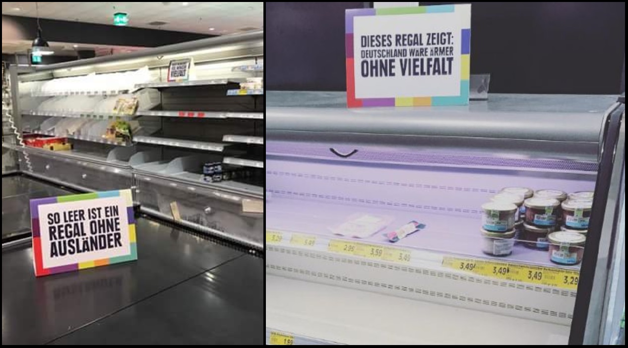 « Superbe campagne anti-raciste d’EDEKA qui vide ses rayons de tous les produits n’étant pas fabriqués en Allemagne et les remplacent par une pancarte ! »