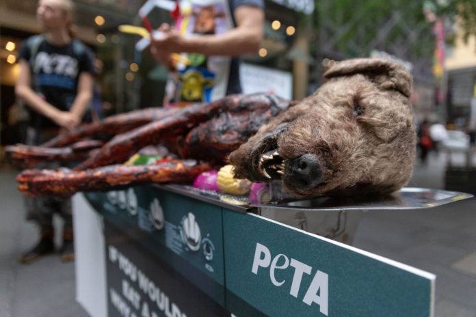 Cette mascarade a été organisée par l’association PETA dans une des grandes artères principales de Sydney en Australie. Les militants n’ont bien sûr pas fait cuire un vrai chien, le but était de choquer un maximum de personnes.