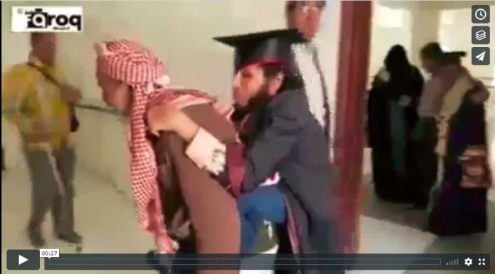 C’est lors de la cérémonie de remise des diplômes que ce père a fièrement porté son fils, malgré son âge avancé et sa fatigue :