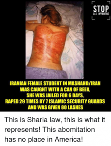 Un mème fréquemment partagé sur les réseaux sociaux présente une femme décrite comme ayant été soumise à la punition d’une flagellation sévère en Iran pour avoir été prise avec une canette de bière à la main (violant ainsi l’interdiction de la consommation d’alcool par l’Islam):