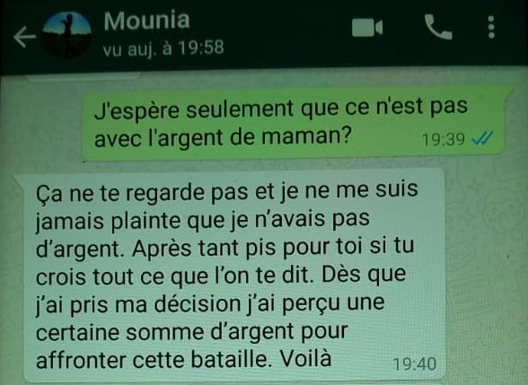 Un message montre clairement que Mounia Rabbouj a écrit alors à son frère avoir « perçu une certaine somme d’argent pour affronter cette bataille. »