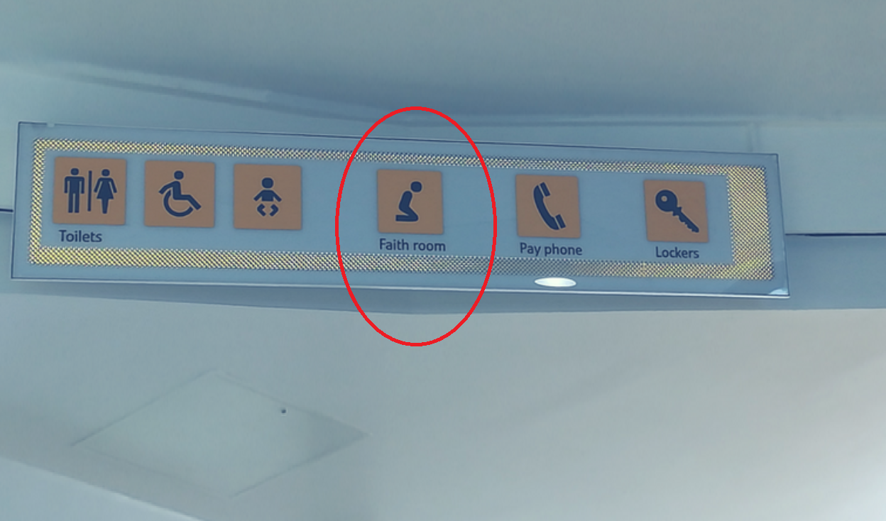 Ainsi l’un des pictogrammes d’un centre commercial situé à Leicester en Angleterre indique clairement qu’une salle de prière, une «Faith rooom» est disponible pour ceux qui souhaitent prier.
