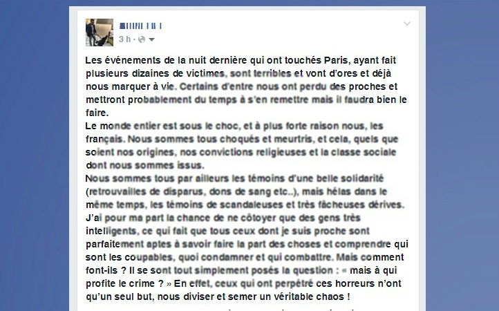 « Les événements de la nuit dernière qui ont touchés Paris, ayant fait plusieurs dizaines de victimes, sont terribles et vont d’ores et déjà nous marquer à vie. Certains d’entre nous ont perdu des proches et mettront probablement du temps à s’en remettre mais il faudra bien le faire.