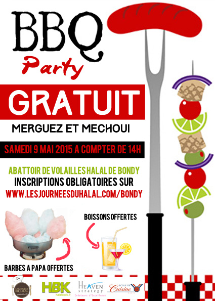 Le Barbecue GEANT et GRATUIT aura lieu le SAMEDI 9 mai 2015 dès 14h, à l’abattoir de volaille Halal de Bondy, tenu par des musulmans et agréé « ABATTOIR EUROPÉEN » par le Ministère de l’Agriculture.