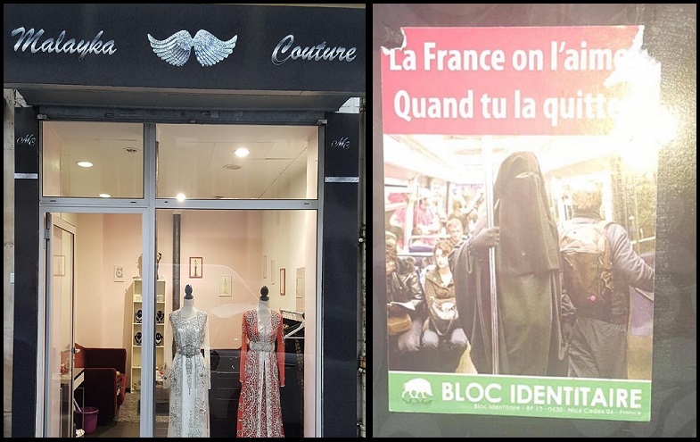 La Boutique Malayka de location de robes orientales, située 3 rue Saint Maur dans le 11e arrondissement de Paris a été vandalisée par des tracts collés sur la devanture. Ces tracts sont signés de la main du groupe d’extrême droite, Bloc identitaire. On y voit une femme en niqab avec pour titre « La France on l’aime, Quand tu la quittes ».